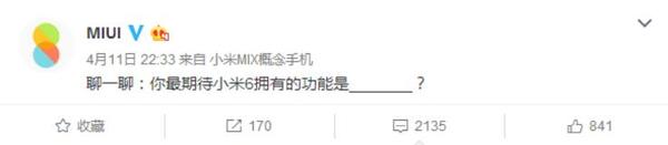 2017年4月11日(也就是前天),小米MIUI官方微博发布了这样一条微博:聊一聊,你最期待小米6拥有的功能是_______?