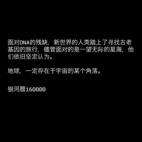 一、连一个“人”都没有的孤独 基因工程滥用,人类无法繁殖,地球被遗忘,沦为神话传说。游戏开始,劈头给出了一个慢慢等死的未来:银河历 16000 年,人类很孤独,没有同类,没有祖先,没有后人。