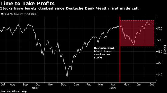 德意志银行财富管理在今年4月底开始变得谨慎,称市场已经上涨,公司的盈利前景令人怀疑,贸易争端在2019年将无法解决。事实证明,这是一个有先见之明的判断:从那时起,全球股票大致持平。