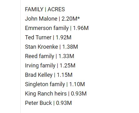 美国最大地主仍是自由传媒集团董事长约翰-马龙( John Malone),他个人名下拥有220万英亩(约合8902平方公里)的土地。