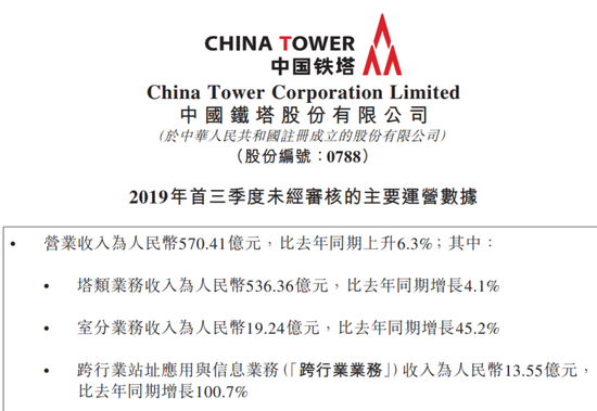 中国铁塔(1.72, 0.01, 0.59%)发布三季度业绩,营业收入为人民币570.41亿元,比去年同期上升6.3%;其中:塔类业务收入为人民币536.36亿元,比去年同期增长4.1%;室分业务收入为人民币19.24亿元,比去年同期增长45.2%;跨行业站址应用与信息业务(“跨行业业务”)收入为人民币13.55亿元,比去年同期增长100.7%;EBITDA为人民币417.74亿元;归属于本公司所有者利润为人民币38.73亿元,比去年同期上升97.5%。