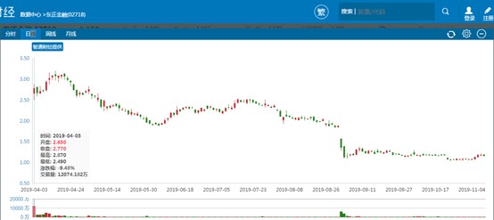 上市之初,东正金融就频发状况。智通财经了解到,公司原定是于3月26日赴港上市,但是推迟到了4月3日,港股发售价也调低至每股3.06港元,募资净额也将由之前的26.72亿港元减少到15.34亿港元。4月3日成功上市首日,公司以低于发行价13.4%的2.65港元开盘,收盘时股价定格在2.77港元,跌幅达9.48%,是今年香港大型IPO表现最差的一笔交易。公司股价随后略有回升,但仅维持了几日高于发行价,便开启了持续下行的模式。