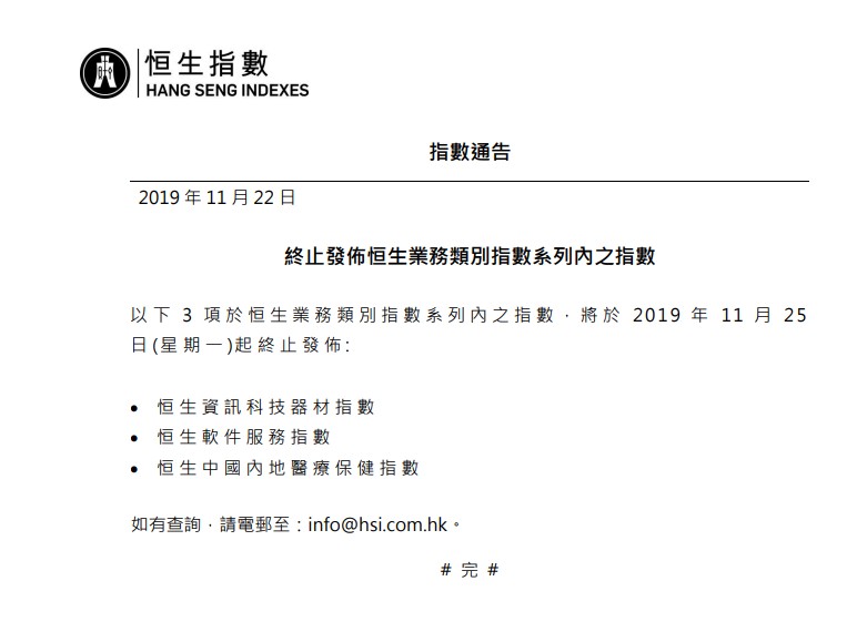 恒指公司发布公告称,恒生资讯科技器材指数(2574.88, -3.50, -0.14%),恒生软件服务指数(6707.74, 123.79,1.88%),恒生中国内地医疗保健指数(5286.76, -19.47, -0.37%)将于下周一(11月25日)起停止发布。