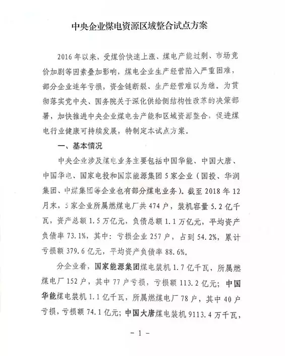本次资源整合试点将从2019年开始启动,试点时间为三年左右。试点整合目标为:力争到2021年末,试点区域产能结构明显优化,煤电协同持续增强,运营效率稳步提高,煤电产能压降四分之一至三分之一,平均设备利用小时明显上升,整体减亏超过50%,资产负债率明显下降。
