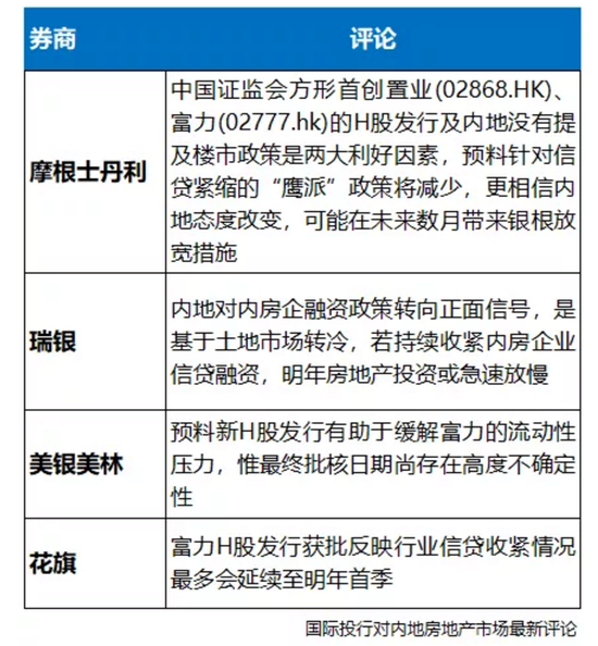 瑞银认为今次中证监放行富力及首创,是内地对内房企业融资政策转向正面的讯号,认为是基于土地市场转冷,若持续收紧内房信贷融资,明年房地产投资或急速放慢。该行更指出,今次放宽,或意味恒大旗下恒大地产回A计划亦有正面回响。