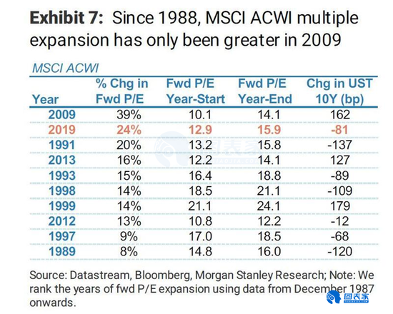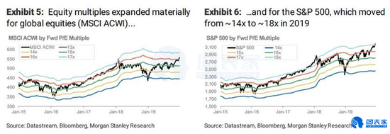 经历了2018年对投资者和全球资本市场的可怕打击之后,2019年呈现了一幅截然不同的景象:美国股市回报率达到近30%,全球股市回报率则为24%。然而,正如摩根士丹利(50.69, -0.03, -0.06%)(Morgan Stanley)上周末指出的那样,2019年是股市“有史以来最离奇的年份之一”。尽管全球采购经理人指数(PMI)恶化,2019年收益下滑,加之贸易摩擦,自2019年1月1日以来,全球股票(MSCI ACWI指数)远期市盈率已上升约24%。