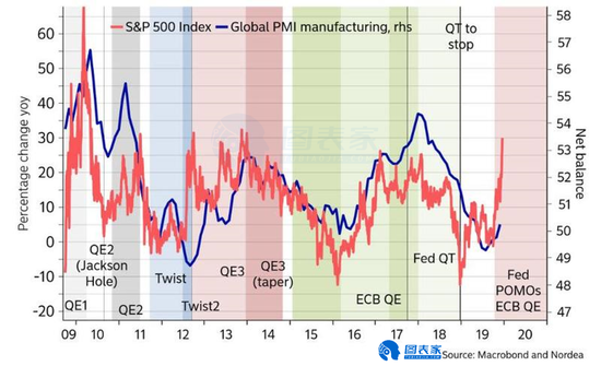 如下图所示,标普500指数已经对全球经济自金融危机以来最强劲的反弹进行了充分定价,但实际上全球PMI仍处在萎缩的边缘。