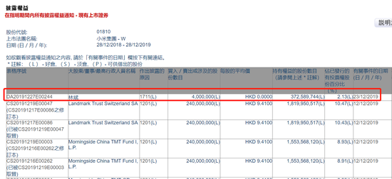 港交所权益披露显示,小米集团副董事长林斌将Apex Star LLC名下400万股,转让给名下家族非盈利慈善基金账户,本次转让不涉及林斌持股数变更,不属于股票出售。