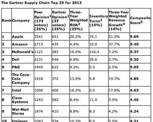 库克接任苹果公司CEO后,库存的周转效率仍在继续提升:2012年,苹果的库存周期是5天,同期的戴尔(50.57, -1.72, -3.29%)需要10天,三星则需要21天。在彼时,戴尔的库存管理模式已经是被整个PC界推崇的模式。 根据市场调研机构Gartner发布的数据,苹果在2013年的存货周转率为74,成为全球供应链效率第一的企业。