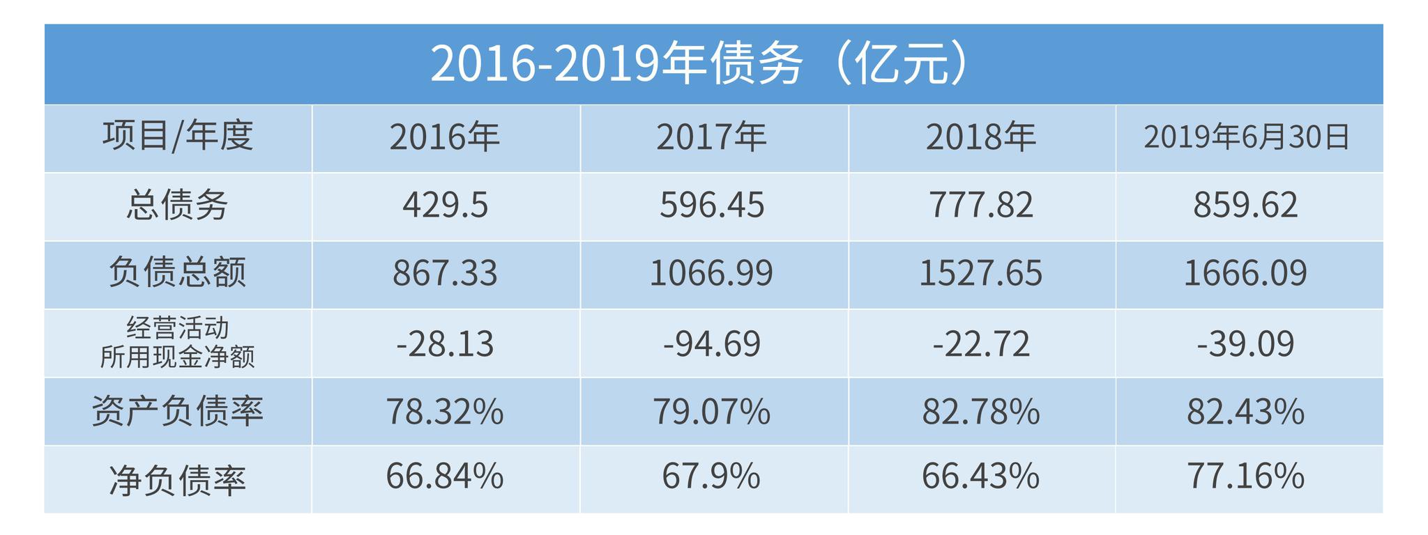 2018年开始,合景泰富负债总额增长43.17%至1527.65亿元;截至2019年6月末,同比增32.01%至约1666.08亿元;资产负债率则为82.43%,较2018年同期的80.71%有所上升。