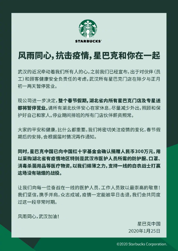 出于对伙伴(员工)和顾客健康安全的考虑,整个春节假期湖北省内所有星巴克门店和专星送都将暂停营业。星巴克中国已向中国红十字基金会确认捐赠人民币300万元,用以采购湖北省有疫情地区特别是武汉市医护人员所需的防护服、口罩、消毒杀菌用品等医疗物资,以我们绵薄之力,支持一线的白衣战士打赢这场没有硝烟的战役。