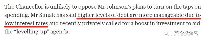 具体来说,新财相苏纳克将不会拒绝鲍里斯加大开支的预算计划,他甚至还表示高负债水平在低利率的情况下更容易控制。