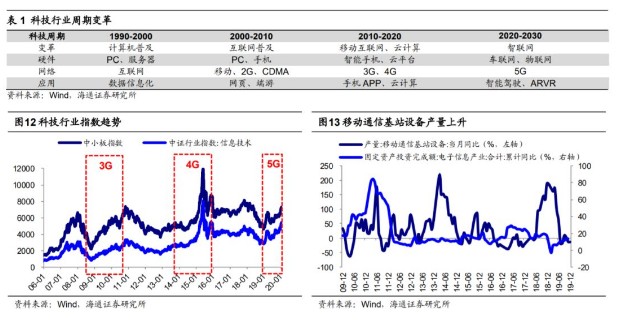 5G引领新一轮科技周期,前期以硬件为主。科技行业技术周期特征明显,一般规律是十年左右一次技术大革新,期间叠加若干小周期。从长周期看,1990年前后互联网开始发展,计算机逐步普及,1994年Mosaic浏览器及World Wide Web的出现,令互联网开始引起公众注意,随后以美国企业为代表出现门户网站需求,1995年-2001年期间美股出现一批互联网公司股价持续上涨,最终以2000年“科网泡沫”告终。