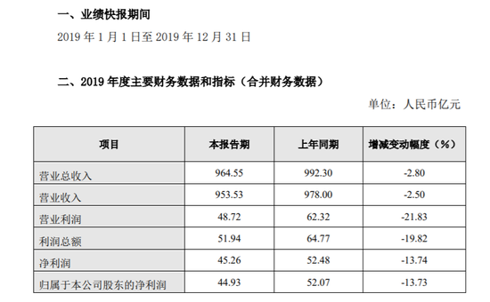 长城汽车(5.92, -0.03, -0.50%)发布业绩快报,2019年营业总收入为964.55亿元,上年同期为992.3亿元,同比减少2.8%。2019年净利润44.93亿元,同比下降13.73%。