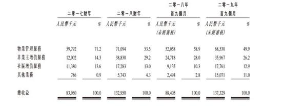 值得关注的是,在这四条业务线中,为营收贡献力度最大的业务是物业管理服务,次之为非业主增值服务。2017年、2018年及2019年前九个月,物业管理服务收益分别占总收益约約71.2%、53.5%及49.9%,呈下滑趋势;而非业主增值服务分別占总收益约14.3%、29.2%及26.2%。同时,社区增值服务收益分別占总收益约13.6%、 13.0%及12.9%,而余下则为其他业务贡献的收益。