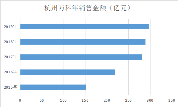 公开资料显示,万科杭州区域2017年的销售业绩为281亿元,2019年的销售业绩约为298亿元,两年间业绩增长幅度为6%。而从整个万科集团来看,其2017年的销售金额为5298.8亿元,2019年销售业绩为6308.4亿元,两年间增长幅度为19%。