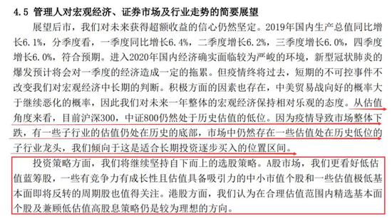 “巧合”的是,同样的话,在今年1月中下发布的基金2019年四季报里也出现过。而众所周知,彼时疫情还未发酵,股票市场正涨势凌厉。