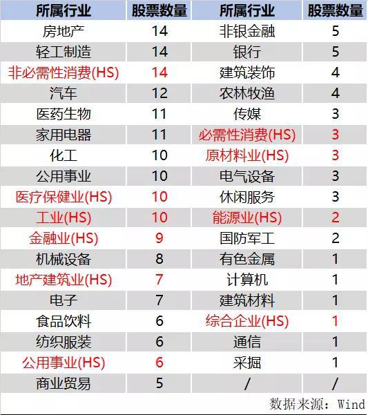 从下面这张表格可以看到,曹名长股票池里的213只股票,有65只是港股,分布在10个行业(带HS为港股)。
