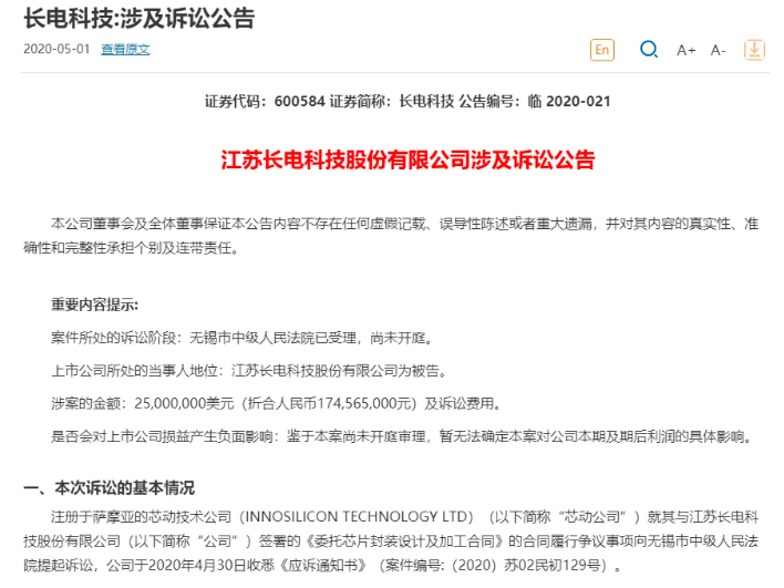 据长电科技4月30日发布的涉诉公告显示,芯动公司在2018年3月与长电科技签订了一份《委托芯片封装设计及加工合同》。芯动公司诉称,长电科技不但封装质量不合格,造成芯片不能正常工作,给其造成来料成本损失1415.14万美元,还暂扣其芯片及库存晶圆,这部分损失也有1286.41万美元,两者相加共计2500万美元。