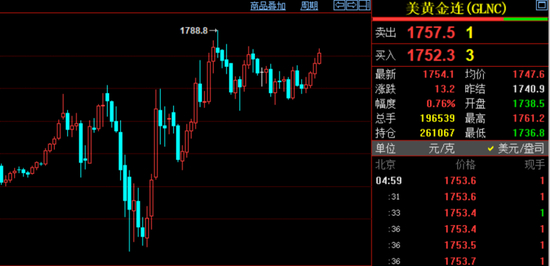 截至5月15日收盘,纽约商品交易所黄金期货市场交投最活跃的6月黄金期价14日比前一交易日上涨13.2美元,收于每盎司1754.1美元/盎司,涨幅为0.76%,这已经是连续4天上涨。