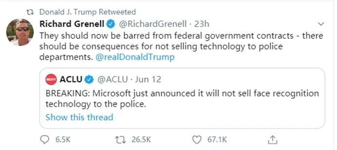 美国总统特朗普也关注到了三家大科技公司禁止警方提供其人脸识别技术的事情。他还转发了一则美国驻德国前大使、同时也是他的支持者理查德·格雷内尔发布的抨击微软公司的贴文,其内容是:既然微软不给警察提供人脸识别技术,那么美国联邦政府也应该禁止微软公司再获得联邦政府的合同。