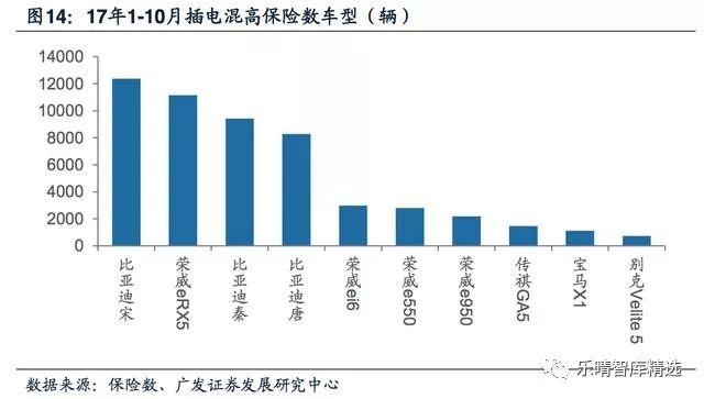 分产品看,17年1-10月,保险数排行前五的插电混车型分别为荣威eRX5、比亚迪宋、比亚迪唐、比亚迪秦、荣威e550,其占比分别为22.6%、20.3%、17.2%、15.1%、5.5%。