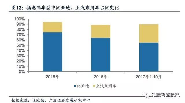 根据交强险数据,15、16、17年1-10月份,上汽乘用车插电车型在插电混车型保险数中的占比分别为19.3%、24.4%、34.9%,占比逐渐上升,而比亚迪插电车型在插电混车型保险数中的占比分别为74.6%、64.0%、54.9%,占比一直维持在很高的水平,但在逐年下滑。