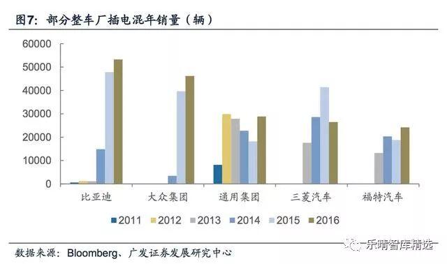 2016年,比亚迪、大众、通用、三菱、福特插电混销量排名前五位。