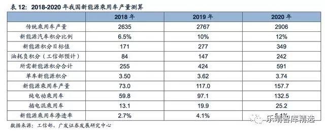双积分政策中对2018年新能源积分8%的比例要求在2018年不做考核,考虑到车企的油耗压力、2019年与2020年新能源积分合并核算、满足2019年10%的比例应是一个渐变的过程,我们保守假设2018年我国新能源积分比例为6.5%,在2016-2020年我国传统乘用车产量年复合增速为5%的假设下,2018-2020年我国新能源乘用车产量分别约为73、117、158万辆,其中插电混乘用车分别约为13、20、25万辆。
