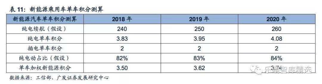 由免购置税新能源汽车合格证数据,目前新能源乘用车中纯电动乘用车合格证占比已超80%,假设2018-2020年我国新能源乘用车中纯电动车型产量占比分别为82%、83%、84%,插电车型单车积分均为2分,纯电车型积分为以上推算的3.83、3.95、4.08,则2018-2020年我国新能源乘用车单车积分分别约为3.50、3.62、3.74。