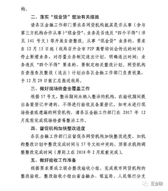 从事“现金贷”业务的,要自监管要求传达之日起停止新增业务,对存量业务制定退出计划,明确退出时间;业务违反“四个不得”要求的,要制定相关整改计划。自查报告及整改(退出)计划应于12月29日前报送各金融局(办)、银监部门。