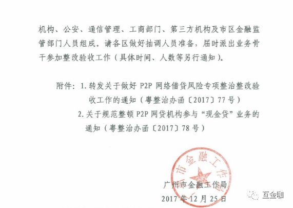 12月25日,互金咖从接近监管的权威人士处获悉,广州市金融局当天正式下发《关于转发省互金整治办P2P网络借贷风险专项整治整改验收和参与“现金贷”业务相关通知的函》(以下简称《验收函》)。