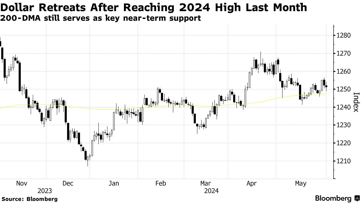 美元指数出现自去年12月以来的首次月度跌幅,美国通胀压力缓解大幅增强外汇交易员们对美联储将在年底前开始下调利率的预期,此前市场曾一度预期美联储今年不降息。衡量美元强弱的美元指数——彭博美元现货指数(Bloomberg Dollar Spot Index)5月份跌幅超过1.5%,美元兑所有主要货币都在下跌,甚至连续四个月下跌的日元也在5月兑美元攀升,这主要归功于日本当局创纪录的620亿美元干预外汇交易市场。