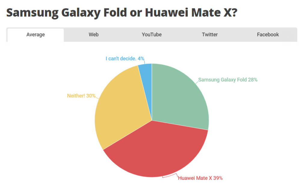 Android Authority通过网络、Youtube、社交媒体发布了投票,让消费者在华为Mate X和三星Galaxy Fold中做出选择,另外也可以选择弃权和两款都不感兴趣。最终,华为Mate X获得了39%的票数,高于“都不选择”(30%)和三星Galaxy Fold(28%),另外还有4%的用户无法决定选择弃权。