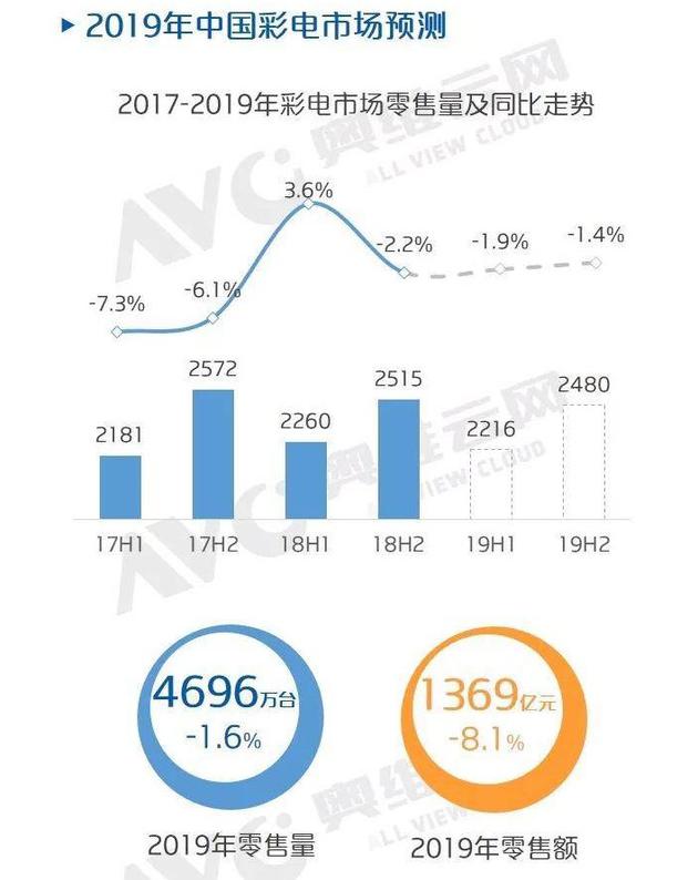 根据中怡康推总数据,2019年1-5月中国彩电市场零售量同比下降4.2%,零售额同比下降13.6%。1-5月市场累计均价仅有2986元,已经不足3000元;奥维云网也预计,2019年全年中国彩电市场零售量4696万台,同比下降1.6%,零售额1369亿元,同比下降8.1%。