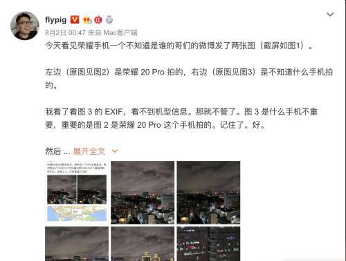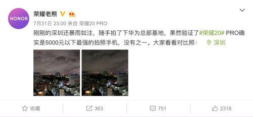 事件源于7月31日,荣耀高管在微博晒出的两张夜拍对比照,这位高管称,“随手拍了下华为总部基地,果然验证了#荣耀20# PRO确实是5000元以下最强的拍照手机,没有之一。”