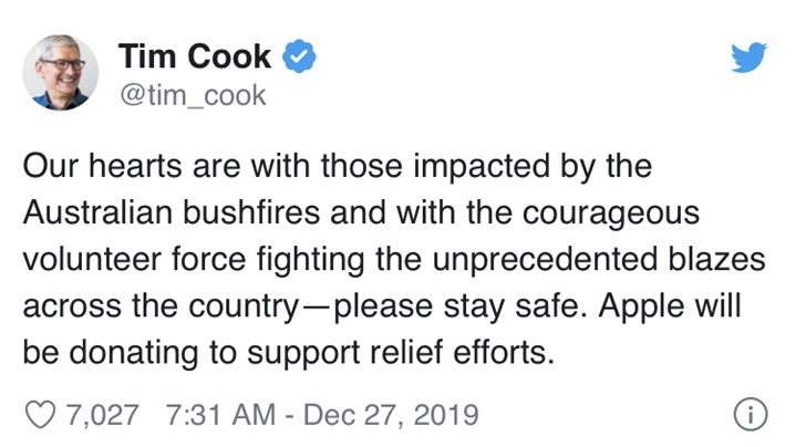 12月,苹果首席执行官蒂姆·库克(Tim Cook)在推特上宣布,公司将为澳洲山火的救援工作捐款。现在,苹果公司将这项工作扩大到网络上,让自己所拥有的14亿苹果用户为澳洲山火救援工作做出贡献。