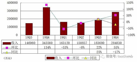 蔚来汽车2019年第四季度总营收为28.483亿元(约4.091亿美元),环比增长55.1%,同比下降17.1%。