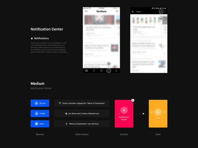 确定产品架构中最重要的信息并将其分类。分类可以使你优先处理哪些通知应该被放到锚点,哪些应该放进通知中心。由于此模型取决于导航,因此通知的布局可以根据可利用的空间进行调整。确保主要的锚点和通知中心可以被轻松的发现。