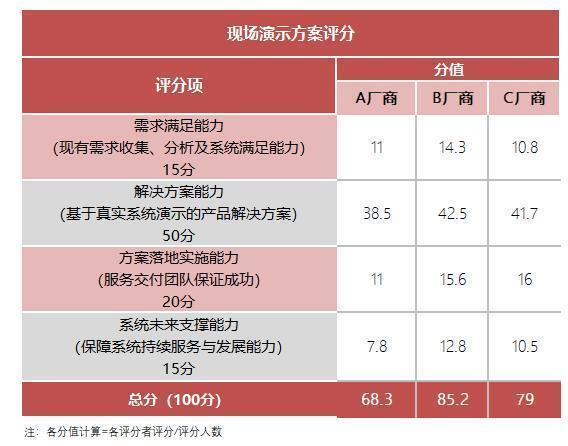 第二阶段为产品方案演示,3家候选厂商到公司现场演示产品方案,公司IT部门、人力业务部门及相关领导一同参与,并对各厂商进行评估打分,梳理了一下评分表供大家参考,因为有不同部门的人参与评分,因此没有设置特别复杂专业的评分项,最后结果取所有人的平均分。