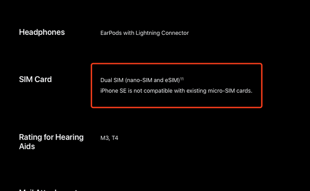 对比中国苹果官网和美国苹果官网发现,新iPhone SE的国行版本取消了eSIM卡功能,而海外的版本是支持该功能的。苹果官网的技术规格页面显示,新iPhone SE的国行版本只支持单nano-SIM卡,美版支持双SIM卡(nano-SIM+eSIM)。