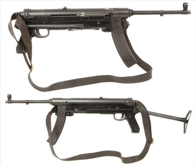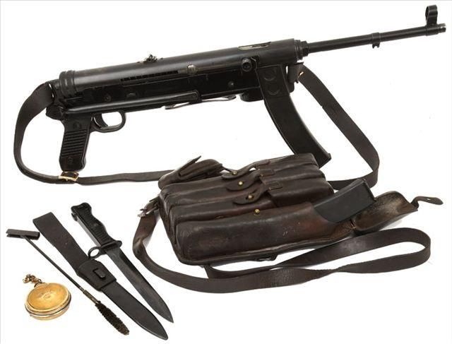 M56式冲锋枪采用自由枪机式工作原理,开膛待击。枪的外形与MP40式9mm冲锋枪相似,只是枪管较细长,枪口增设了带柄剌刀。拉机柄位于机匣右侧并具有自动保险作用,拉机柄向后时一旦失手滑脱,拉机柄将进入机柄槽上的保险缺口,将枪机挂住,防止偶发。该枪的金属枪托与MP40式相同,向右折叠后位于机匣右下侧。