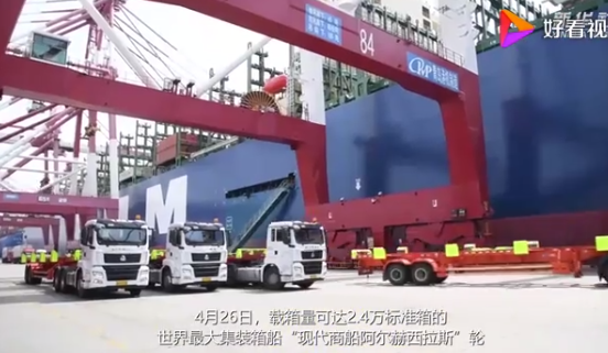 载箱量可达2.4万标准箱的世界最大集装箱船“现代商船阿尔赫西拉斯”轮从山东青岛港开启首航,这条船的甲板面积超过2.4万平方米,相当于3.5个标准足球场大小。
