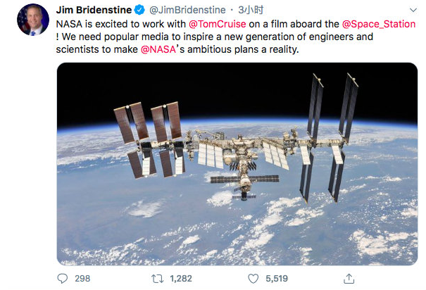 美国航天局局长吉姆·布里登斯廷正式宣布:NASA将与汤姆·克鲁斯一同在太空站拍摄电影! 此前据外媒《Deadline》报道,汤姆·克鲁斯正在和埃隆·马斯克的Space X一起,与NASA(美国航空航天局)商谈一个合作项目:去外太空拍一部动作冒险剧情电影。