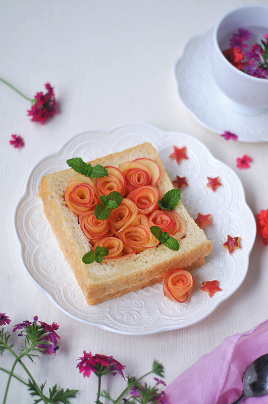 周末赶着烤了个面包,吃剩下的就没人喜欢了,剩余的土司,尝试着做苹果花土司,没想到超容易呀,一次就成功了。 这道漂亮的苹果土司卷,看起来繁琐,其实做起来非常的简单,提前烤好土司,不用早起也能从容地为家人准备花样早餐了。 [苹果玫瑰土司卷] 食材: 土司两片、红苹果一个、草莓酱一包、清水30克、白砂糖30克 过程: 制作步骤1制作步骤1 1、食材准备好。 制作步骤2制作步骤2 2、用手指将土司中间部分按下去一点,形成小凹槽的样子。 制作步骤3制作步骤3 3、涂上蓝莓果酱,喜欢就多涂点哦。 制作步骤4制作步骤4 4、另一片土司切出中间部分,我们只需要这个框框,中间部分可以直接吃掉了。 制作步骤5制作步骤5 5、把切好的土司框框叠到刚刚涂好果酱的土司片上。 制作步骤6制作步骤6 6、苹果切除中间的芯。 制作步骤7制作步骤7 7、切成薄片,尽量切到最薄,越薄越好。 制作步骤8制作步骤8 8、切之前拿盆加一勺盐进去,搅拌融化,边切边将苹果片扔进盆中浸泡,知道将苹果片全部切完就可以了,这样可以防止苹果氧化。 制作步骤9制作步骤9 9、苹果片切好后,我们开始把白糖倒进锅里,加入水,开火把白糖融化一下。糖水沸腾后把苹果片放进去,烫一下,苹果片软化立刻关火,煮久了苹果的颜色会变淡哦。 制作步骤10制作步骤10 10、把苹果片拿起,从锅的边缘拉出来,去除多余的糖水。 制作步骤11制作步骤11 11、将苹果片一片叠一片排列整齐,八片组成一朵。 制作步骤12制作步骤12 12、然后从左边开始将苹果片卷起来。 制作步骤13制作步骤13 13、卷好的玫瑰花放进刚刚做好的土司槽里。 制作步骤14制作步骤14 14、九个玫瑰卷全部摆进去,插上薄荷装饰下即可。 小贴士: 1、苹果片不嫩久煮哦,时间长了颜色会变淡。 2、做玫瑰花的苹果片最好是8-10片,因为这个花瓣数卷起来放在土司槽内,一排刚好可以赛三个,满满而不变形。