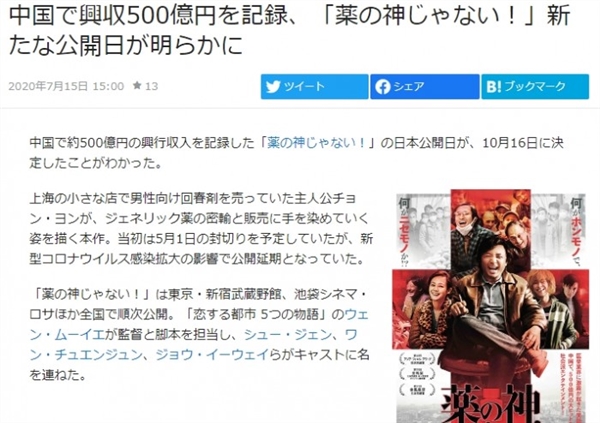 2018年夏天上映的国产电影《我不是药神》绝对算得上是一款口碑之作,不仅票房高达31亿元,同时豆瓣评分也达到了9.0分。 据日媒报道,《我不是药神》重新在日本定档2020年10月16日上映。本片原定今年5月1日在日本上映,但随疫情影响本片档期进行调整。 值得一提的是,日媒在报道本片时,标题用上了换算来的“500亿日元”票房成绩。 据了解,《我不是药神》以印度抗癌药“代购第一人”陆勇的故事为原型改编,讲述了神油店老板程勇从一个交不起房租的男性保健品商贩,一跃成为印度仿制药“格列宁”独家代理商的故事。 该片由文牧野执导,徐峥、王传君、谭卓、章宇、杨新鸣等出演,2018年在国内上映,收获31亿票房。 影片曾获第32届中国电影金鸡奖最佳故事片奖提名,文牧野也凭借该作斩获金鸡奖最佳导演处女作奖项。 用导演的话说,它是很多人口中那种“能改变社会的电影”。