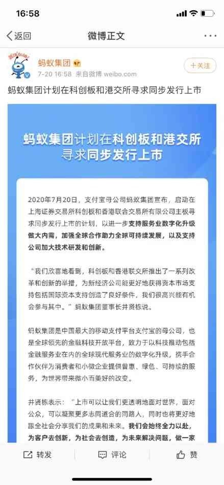 马云曾几次公开表示,希望支付宝在国内上市,让国内老百姓能分享公司发展的成果。 刚刚,支付宝母公司蚂蚁集团宣布,将计划在A股科创板和港股寻求同步上市。如能成功上市,这将是第一个真正在A股首发上市的互联网巨头公司,让A股多一个优质企业。 1. A股日交易额过万亿已是常态,市场资金充沛。截至7月17日,沪深两市成交额连续第12个交易日破1万亿元。 2.科创板制度日益完善,战略配售制度“减震”:科创板鼓励战略投资者参与战略配售,引入市场稳定增量资金,阿里作为大股东也可优先认购。这两重“稳定器”预计可以引入大量增量资金。