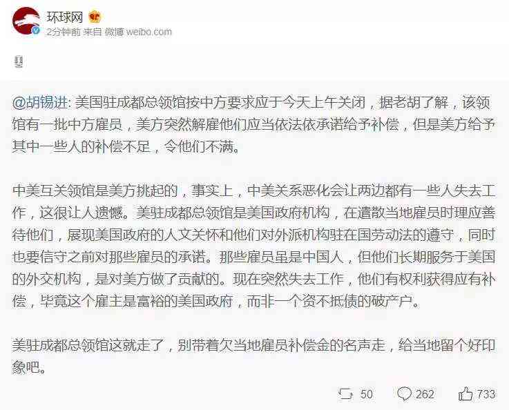 胡锡进:美国驻成都总领馆按中方要求应于今天上午关闭,据老胡了解,该领馆有一批中方雇员,美方突然解雇他们应当依法依承诺给予补偿,但是美方给予其中一些人的补偿不足,令他们不满。 中美互关领馆是美方挑起的,事实上,中美关系恶化会让两边都有一些人失去工作,这很让人遗憾。美驻成都总领馆是美国政府机构,在遣散当地雇员时理应善待他们,展现美国政府的人文关怀和他们对外派机构驻在国劳动法的遵守,同时也要信守之前对那些雇员的承诺。那些雇员虽是中国人,但他们长期服务于美国的外交机构,是对美方做了贡献的。现在突然失去工作,他们有权利获得应有补偿,毕竟这个雇主是富裕的美国政府,而非一个资不抵债的破产户。 美驻成都总领馆这就走了,别带着欠当地雇员补偿金的名声走,给当地留个好印象吧。