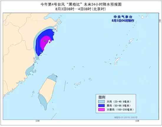 预计“黑格比”将以每小时20-25公里的速度向西北方向移动,强度还将继续增强,最强可达强热带风暴级或台风级(30-35米/秒,11-12级),并将于3日夜间至4日凌晨在浙江温岭到苍南一带沿海登陆(强热带风暴级,10-11级,25-30米/秒)。 3 01:08 视频:台风“黑格比”逼近浙江 沿海各地积极应对 确保渔船安全避风,时长约1分8秒 中国天气网讯 中央气象台8月3日06时发布台风黄色预警: 今年第4号台风“黑格比”已于3日早晨由热带风暴级加强为强热带风暴级,早晨5点钟其中心位于浙江省苍南县东南方大约460公里的台湾以东洋面上,就是北纬24.5度、东经123.6度,中心附近最大风力有10级(25米/秒),中心最低气压为988百帕,七级风圈半径150-230公里。 预计,“黑格比”将以每小时20-25公里的速度向西北方向移动,强度还将继续增强,最强可达强热带风暴级或台风级(30-35米/秒,11-12级),并将于3日夜间至4日凌晨在浙江温岭到苍南一带沿海登陆(强热带风暴级,10-11级,25-30米/秒)。登陆后将逐渐转向偏北方向移动,强度逐渐减弱。 大风预报:8月3日08时至4日08时,台湾以东洋面、台湾海峡、东海大部及钓鱼岛附近海域、台湾岛沿海、福建中北部沿海、浙江沿海、上海沿海、长江口区、杭州湾将有6-7级大风,其中浙江沿海、福建北部沿海、台湾以东洋面、东海南部的部分海域及钓鱼岛附近海域的风力有8-9级,阵风可达10-11级,“黑格比”中心经过的附近海域和地区风力可达10-12级,阵风13-14级。 降水预报:8月3日08时至4日08时,浙江东南部、福建东北部、台湾岛北部和西南部等地的部分地区有大到暴雨,其中浙江东南部局地大暴雨(100-200毫米)。 防御指南: 1.政府及相关部门按照职责做好防台风抢险应急工作。 2.相关水域水上作业和过往船舶应当回港避风,加固港口设施,防止船舶走锚、搁浅和碰撞。 3.停止室内外大型集会和高空等户外危险作业。 4.加固或者拆除易被风吹动的搭建物,人员切勿随意外出,应尽可能待在防风安全的地方,确保老人小孩留在家中最安全的地方,危房人员及时转移。当台风中心经过时风力会减小或者静止一段时间,切记