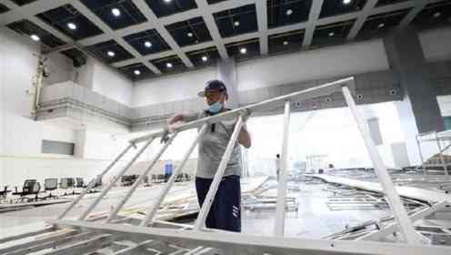 8月13日,工作人员在江汉方舱内进行拆除作业。 当日,为应对新冠肺炎疫情设立的武汉江汉方舱医院正式开始关舱拆除作业。 据介绍,江汉方舱医院是由武汉国际会展中心改建而成,2月5日开始收治第一批患者。截至3月9日休舱,江汉方舱医院共收治患者1848人,累计治愈出院1327人、转出521人。